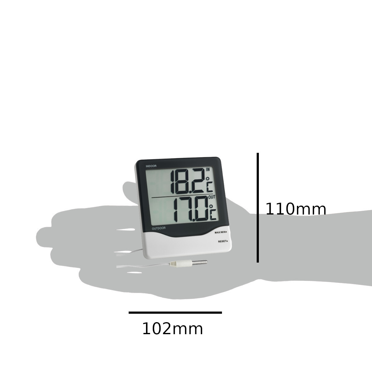 Postavljen blizu prozora, kabel senzora za mjerenje vanjske temperature jednostavno se provlači van. Memorija maksimalne/minimalne vrijednosti s ručnim resetiranjem omogućuje vam praćenje vršnih vrijednosti tijekom korisnički definiranog razdoblja.