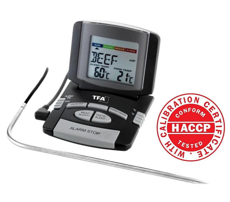 Za optimalnu pripremu mesa i peradi praćenjem temperature jezgre, može se koristiti za peći ili roštilj, također idealan za kuhanje na niskim temperaturama, različite vrste mesa (govedina, svinjetina piletina, puretina, tele, janjetina, pršut, patka, rebra, mljevenog mesa / dobro učinio, srednje, srednje rijetka, rijetko), pojedinačni temperaturni zahtjevi se mogu programirati, tri razine alarma za postizanje željene temperature, senzor s 1 m toplinski otpornim silikonskim kabelom (do 220 ° C), sa stolnim stalkom te preklopnim zaslonom i magnetom.