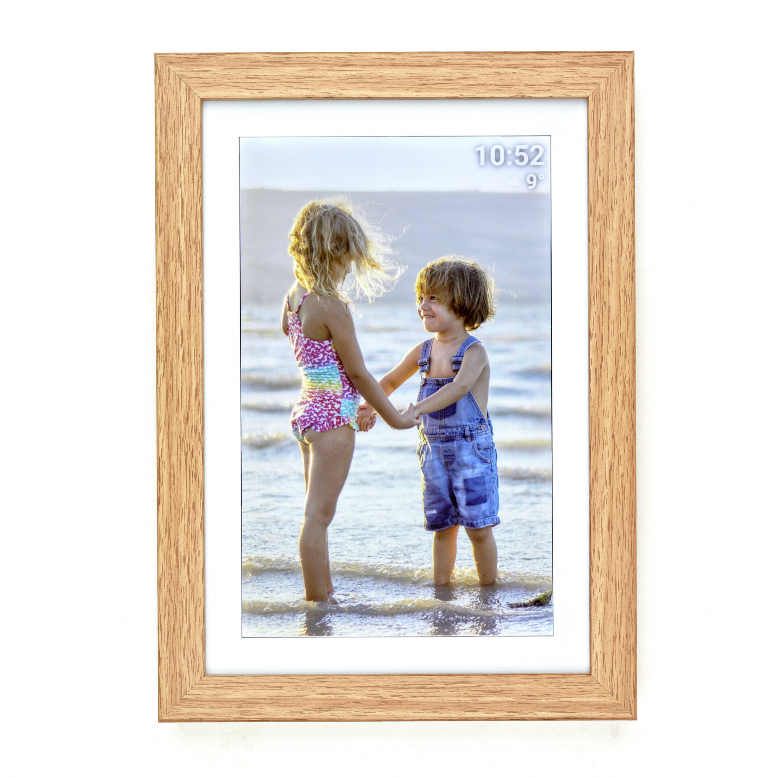 Okvir se napaja kabelom. Dok prolazite, ne samo da ćete vidjeti svoje fotografije, već i vrijeme i, opcionalno, vremensku prognozu (uključujući temperaturu) prikazanu u gornjem desnom kutu.