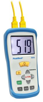 Priručan 2-kanalni termometar sa funkcijom prikaza temperaturne diferencije (delta T) između kanala 1 i kanala 2 (T1-T2). Uređaj sadrži pozadinsko osvijetljenje zaslona tako da je korištenje PKT-5115 moguće i kod teških uvjeta u industriji. Mjerač temperature PKT-5115 radi sa termoelementima K-tipa (NiCr-Ni) i standardnim minijaturnim utikačem. Isporuka sadrži mjerač temperature, 2 komada po 1m žičanih-temperaturnih osjetnika i baterije – tako da mjerenje temperature može odmah početi. Daljnja prednost mjerača temperature je mogućnost odabira mjerne jedinice (°C ili °F ).